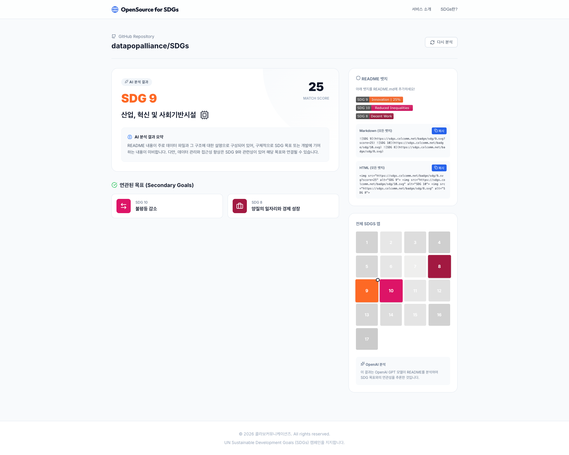 README 기반으로 어떤 SDGs가 매칭되는지 바로 확인할 수 있습니다.